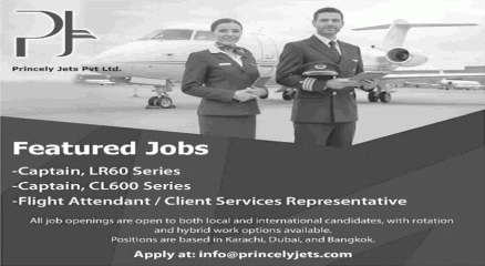 Princely Jets is hiring Captains for LR60 & CL600 series and Flight Attendants. Open to local and international candidates with rotation and hybrid work options in Karachi, Dubai, and Bangkok.