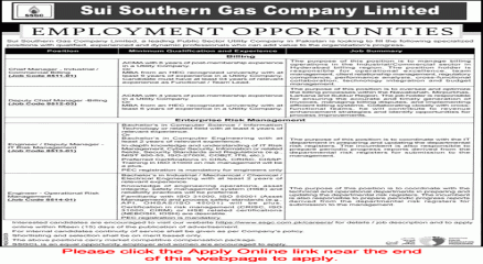 Sui Southern Gas Company Limited (SSGCL) is hiring for billing and risk management positions. Apply online within 15 days for these competitive utility sector jobs.
